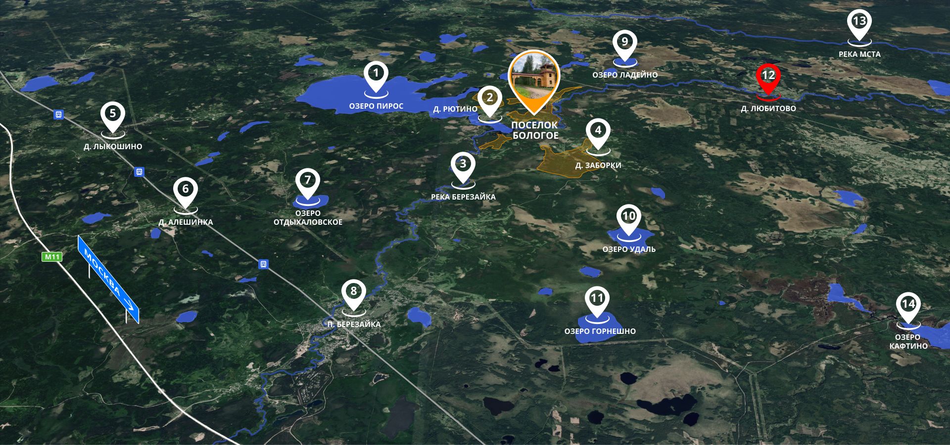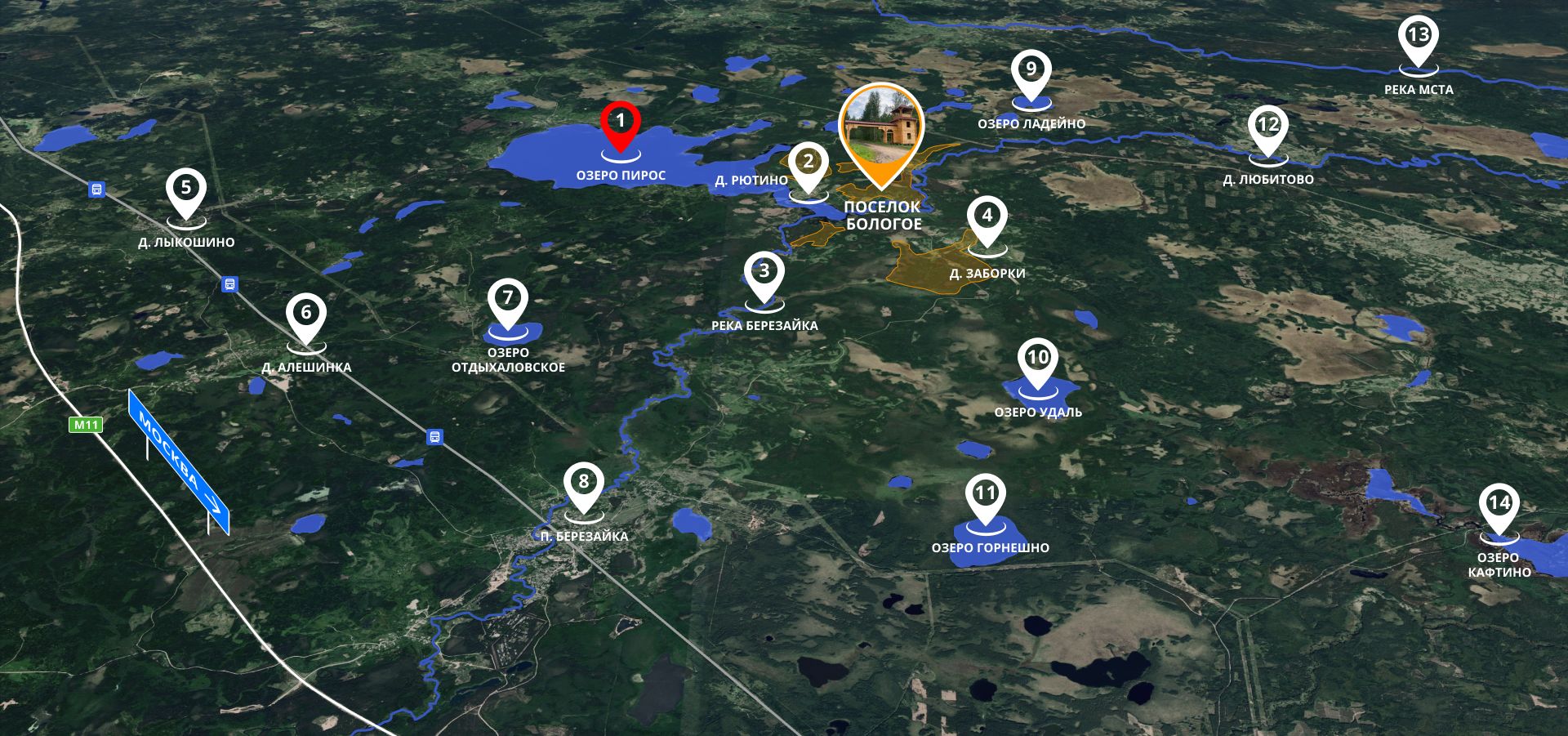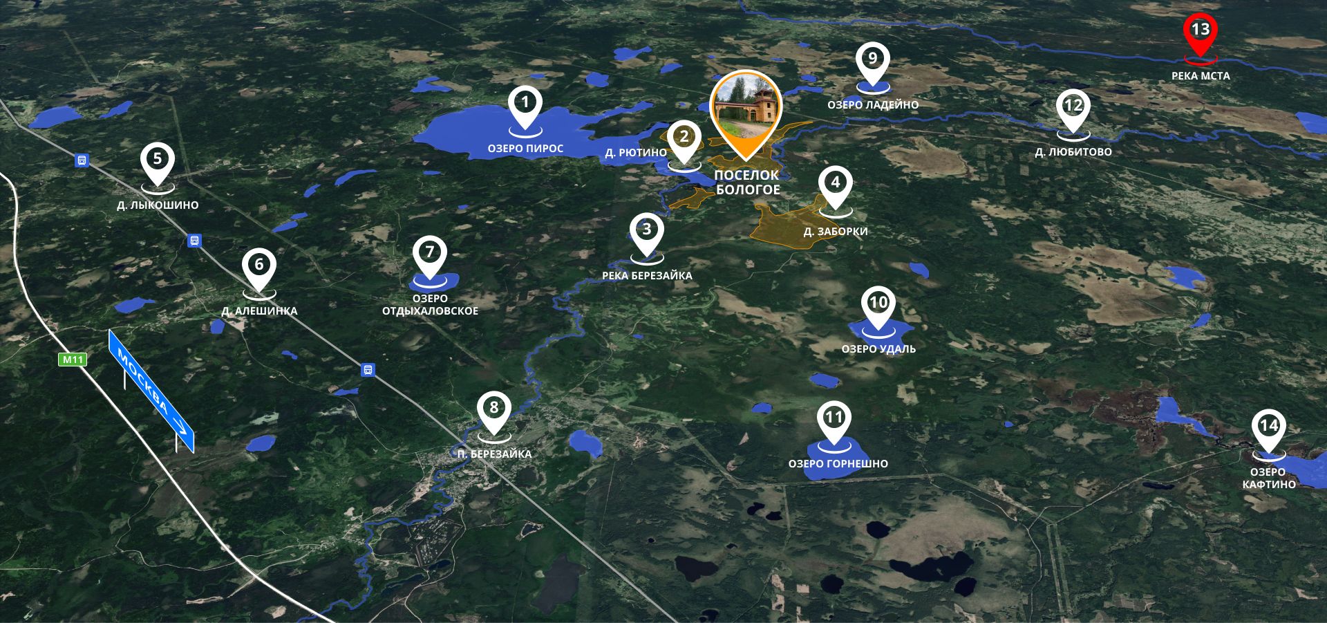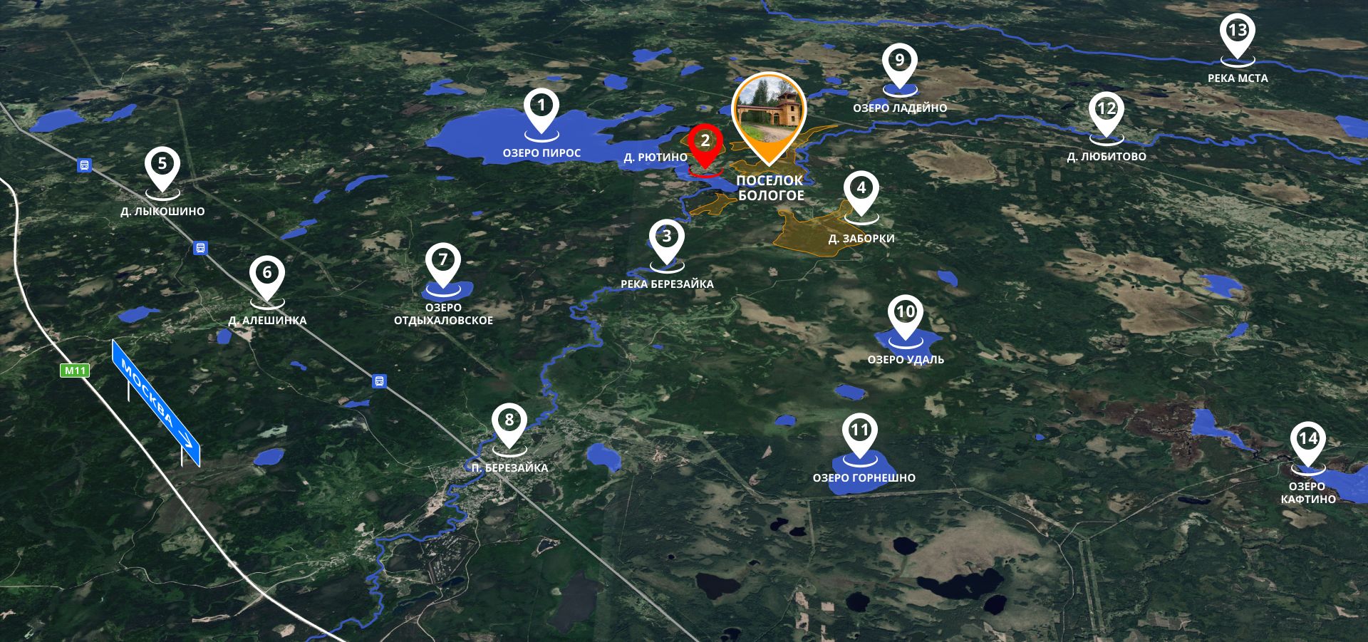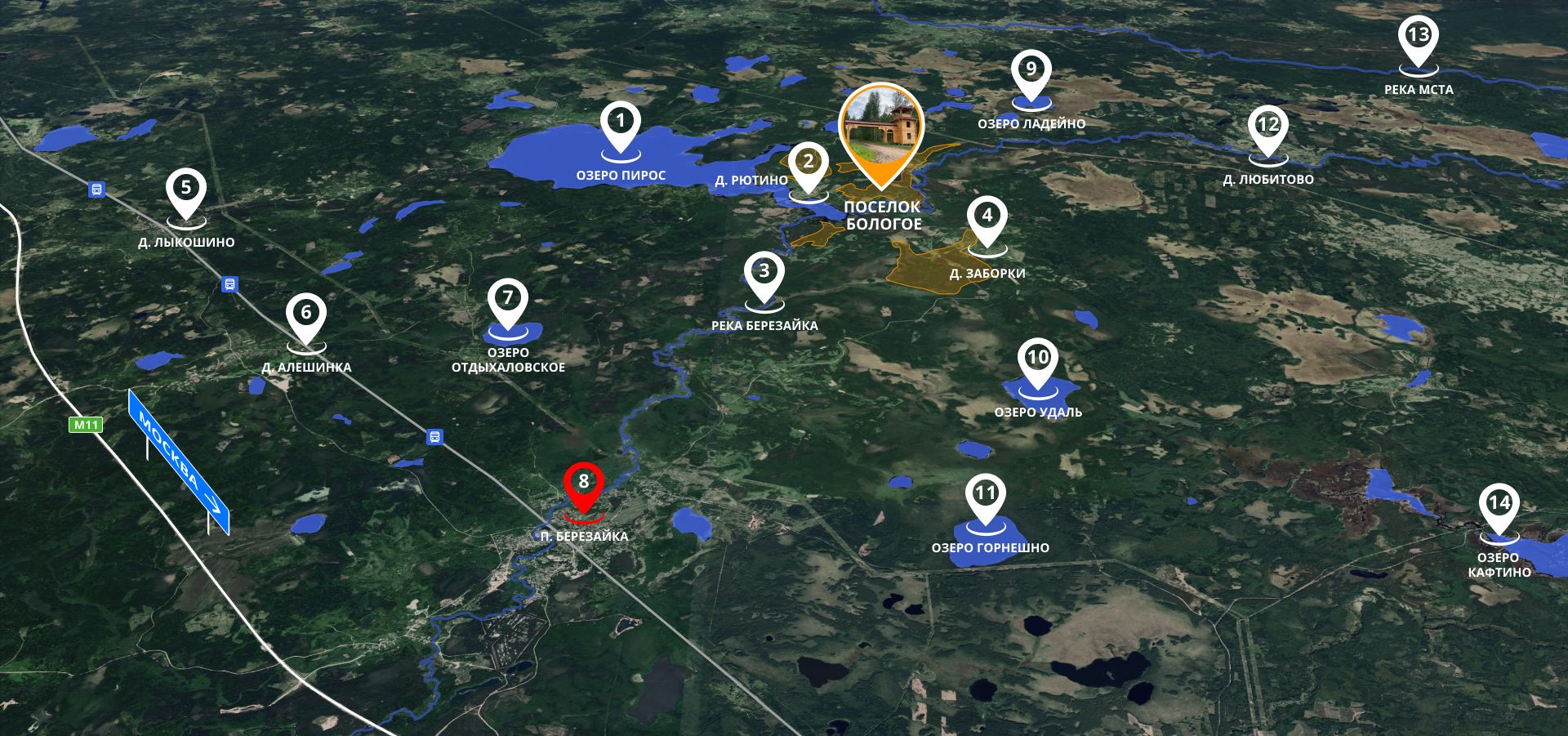 Поселок расположен в экологически чистом Бологовском районе вблизи деревни Рютино недалеко от озера Пирос. Рядом протекает река Березайка. В часе езды от поселка — город Бологое Тверской области, который расположен практически ровно посередине между двух главных городов страны: Санкт-Петербург (318 км) и Москва (331 км). В городе есть вся необходимая инфраструктура: магазины, аптеки, образовательные и медицинские учреждения, а также множество исторических мест и достопримечательностей, такие как церковь Троицы Живоначальной, храм-часовня Тихона Задонского, памятник-паровоз Эу706-10, памятник Любви и другие.