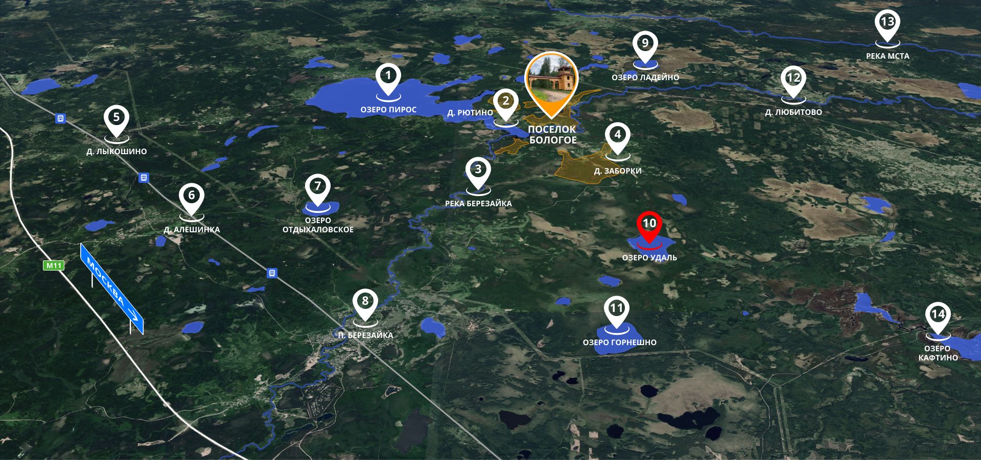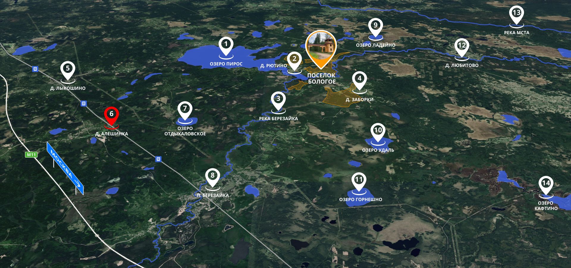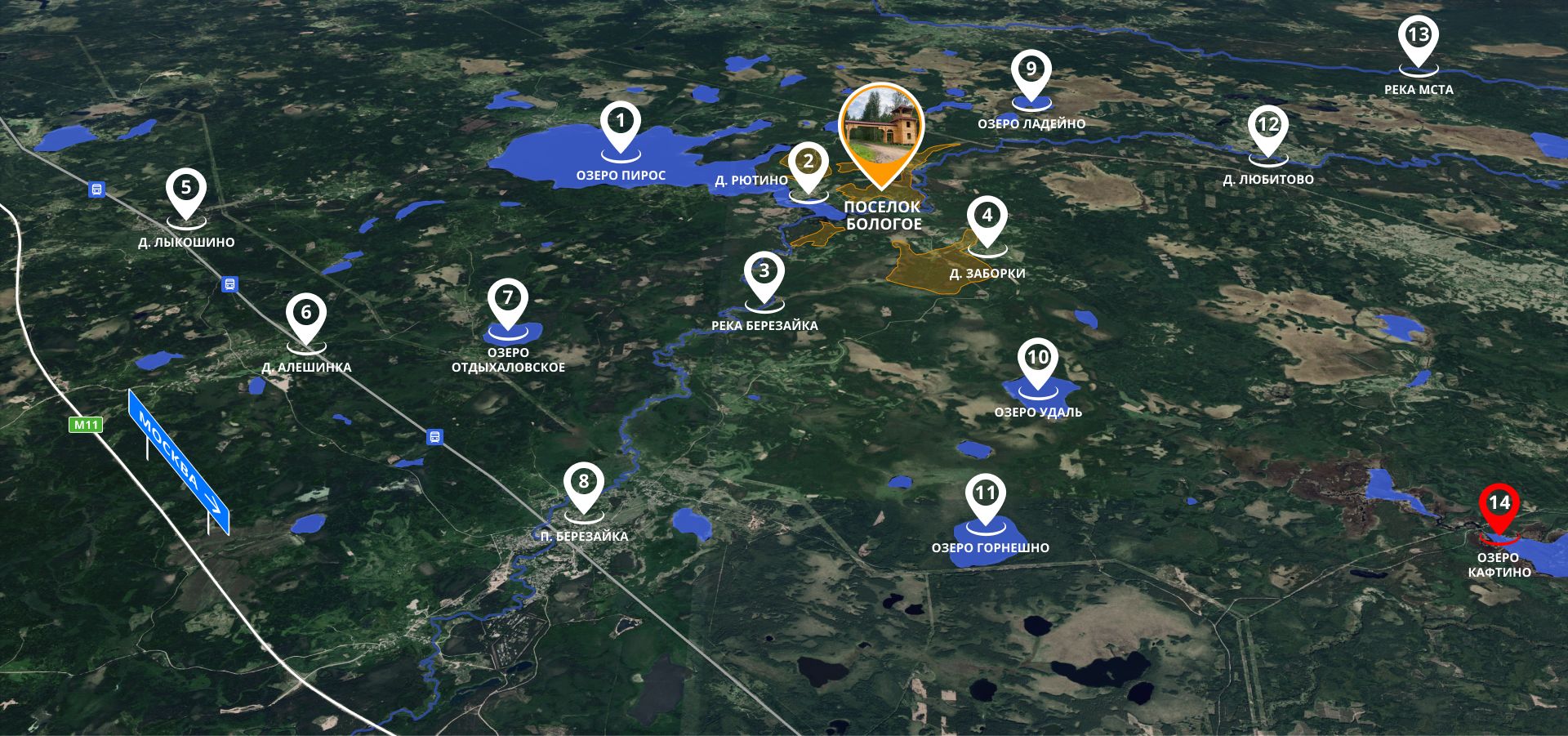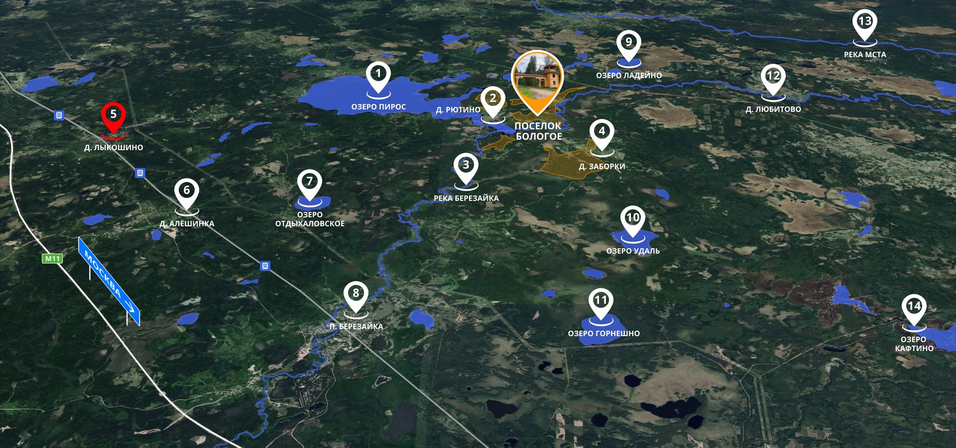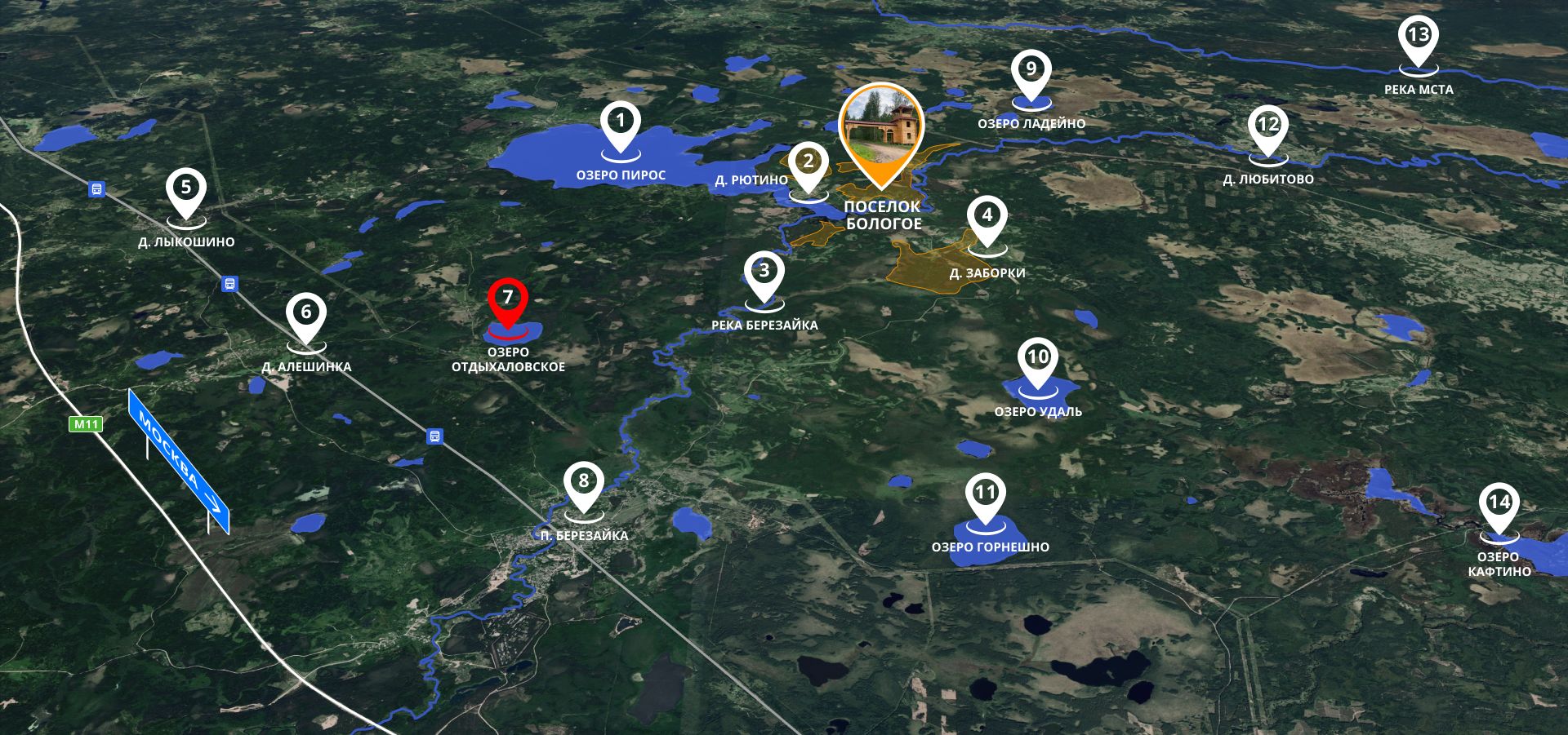 Поселок расположен в экологически чистом Бологовском районе вблизи деревни Рютино недалеко от озера Пирос. Рядом протекает река Березайка. В часе езды от поселка — город Бологое Тверской области, который расположен практически ровно посередине между двух главных городов страны: Санкт-Петербург (318 км) и Москва (331 км). В городе есть вся необходимая инфраструктура: магазины, аптеки, образовательные и медицинские учреждения, а также множество исторических мест и достопримечательностей, такие как церковь Троицы Живоначальной, храм-часовня Тихона Задонского, памятник-паровоз Эу706-10, памятник Любви и другие.